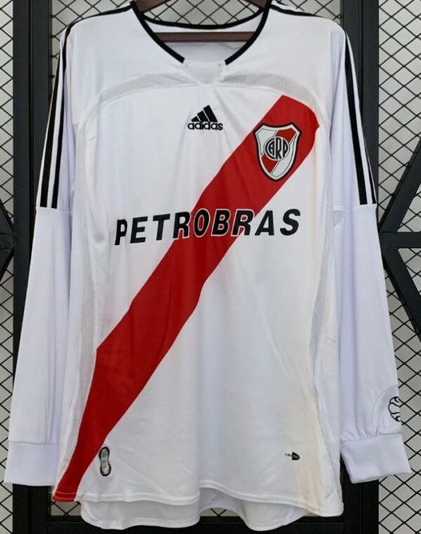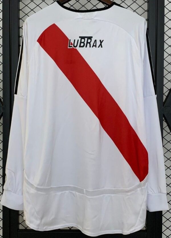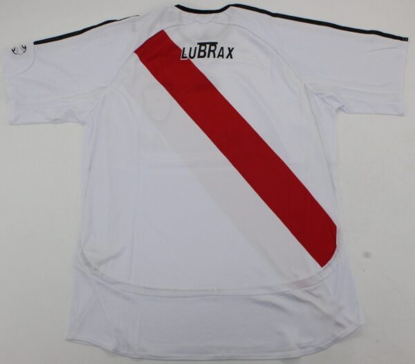 The design includes black accents on the sleeves and collar, adding a sleek contrast to the classic white and red color scheme. It’s a perfect blend of style and functionality, reflecting the standards of both River Plate and Adidas during the mid-2000s.