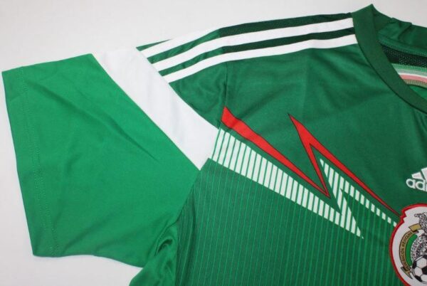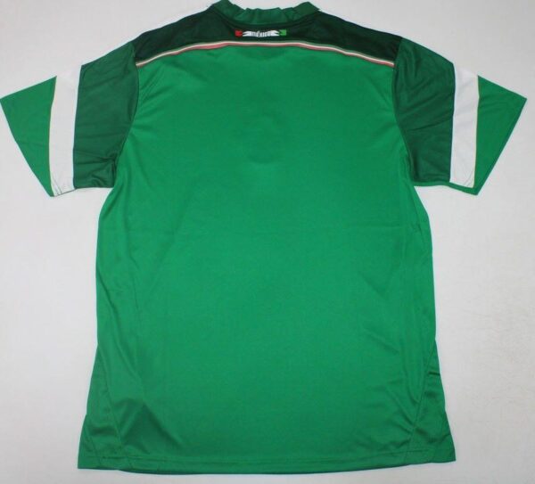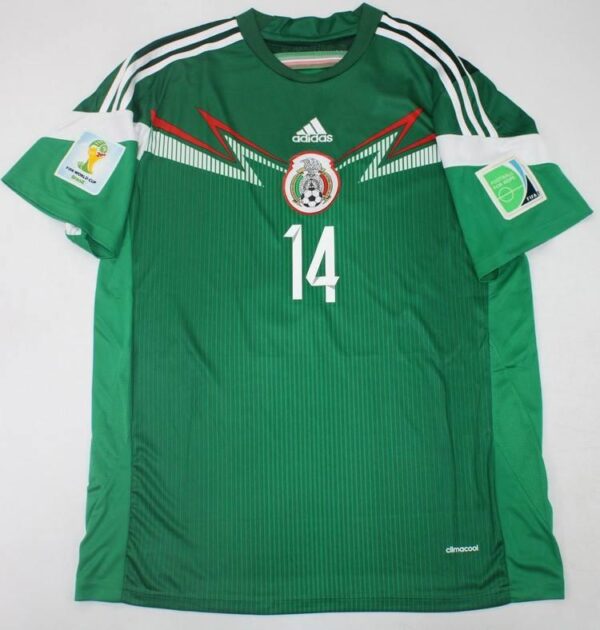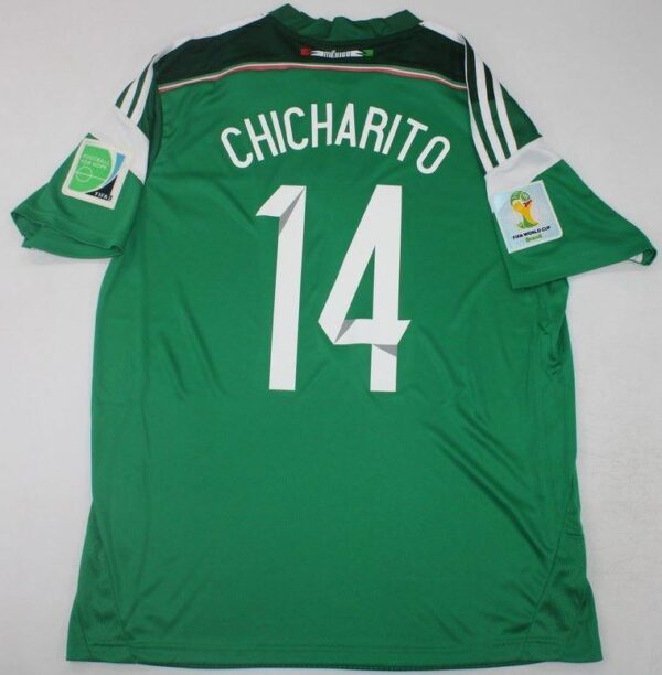 This is the green jersey worn by the Mexico team at the 2014 World Cup in Brazil. Mexico surprises in the first round, beating Croatia and drawing with Brazil.