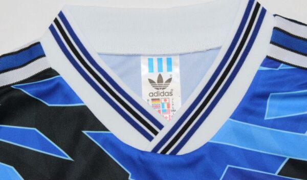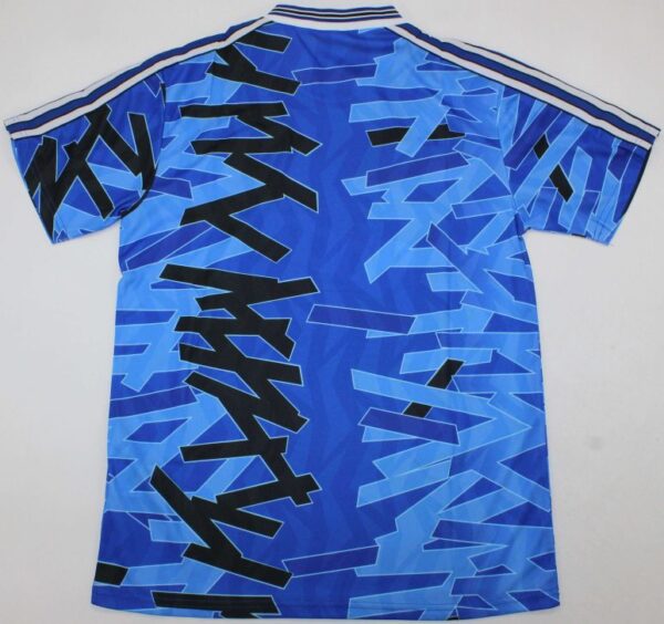 Step back into the early ’90s with this iconic Schalke 04 home jersey from the 1992-93 season. This shirt stands out with its bold geometric blue and black pattern, a true reflection of the unforgettable football fashion of the decade.